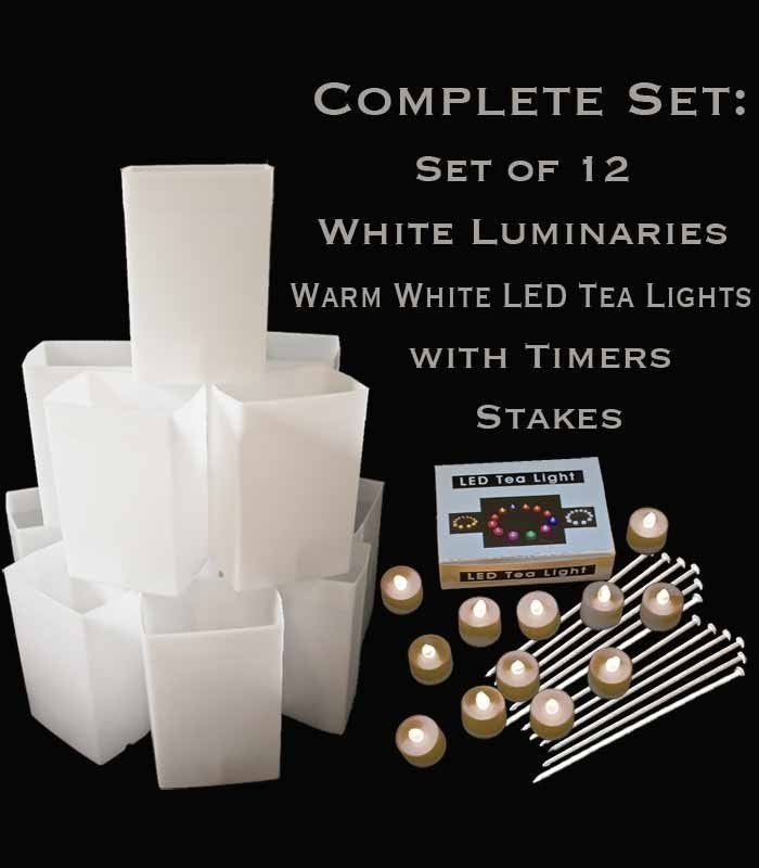 3. LED Tea Lights with Timers - Our second most-popular light source. 12 individual tea Lights to match set of 12 luminaries. No more having to turn your tea lights on an off every evening! Simply turn them on once (at the time you want them to come on every evening) and they will stay on for 5 hours and then will automatically shut off for 19 hours. It will continue this same timing sequence every following evening. All you have to do is turn them on once! PROS: Nice flickering light mimics candles. No fire hazard. No electric cords involved. Batteries last approximately 35 hours. CONS: Less brightness than electric light strings. *These LED tea lights are water resistant but not waterproof. If you plan to keep them outside in wet weather we advise you place each light into a Ziploc snack bag to keep them dry.