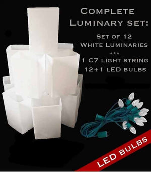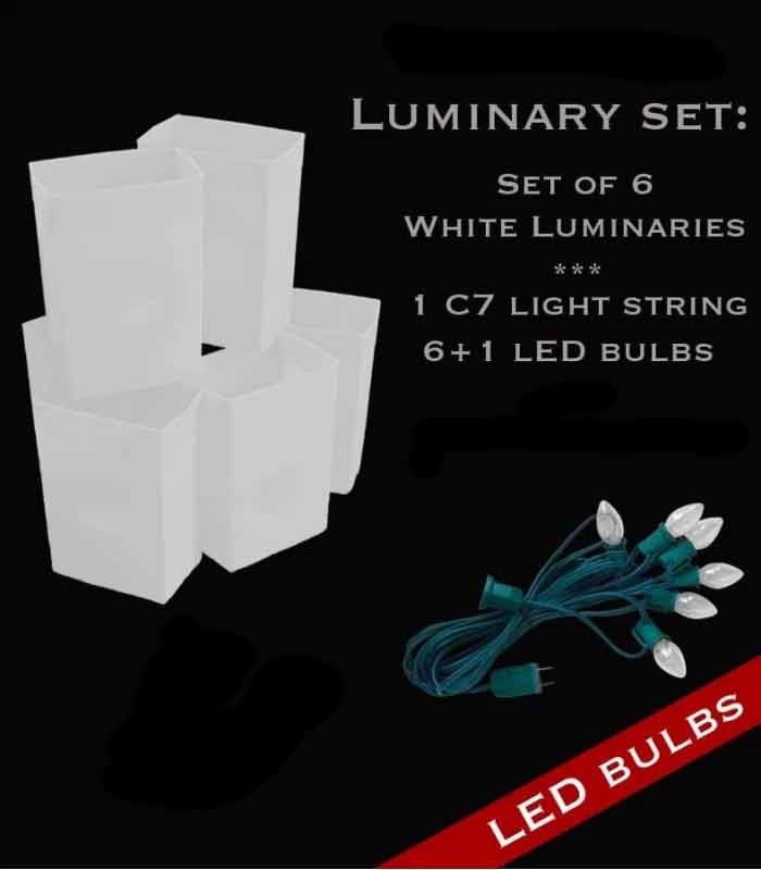 1. No Light Source - Our luminarias are designed for general use. If you have your own tealights, candles or C7 light strings, you can use them with our luminaries. If using candles, we advise some kind of candle holder and always monitor while in use.